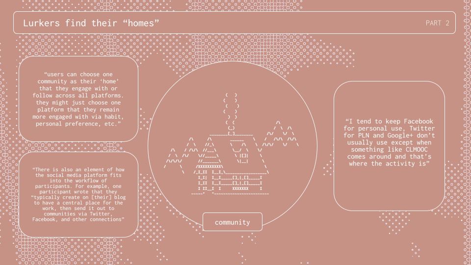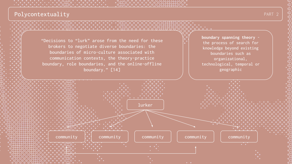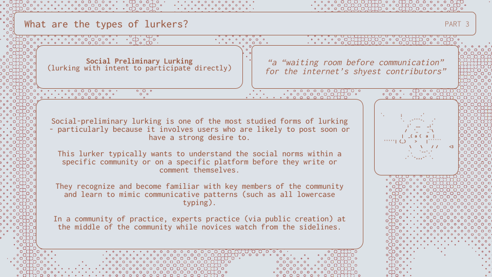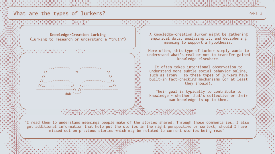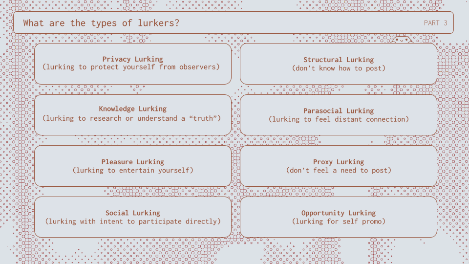 As motivations and needs change, lurkers shift between different forms of lurking. Varying from pure consumption to periphery learning, lurkers tend to follow a more-than-average amount of content from a diverse range of potential sources. When considering who might hold the knowledge and memory of the internet—maybe it could be lurkers?