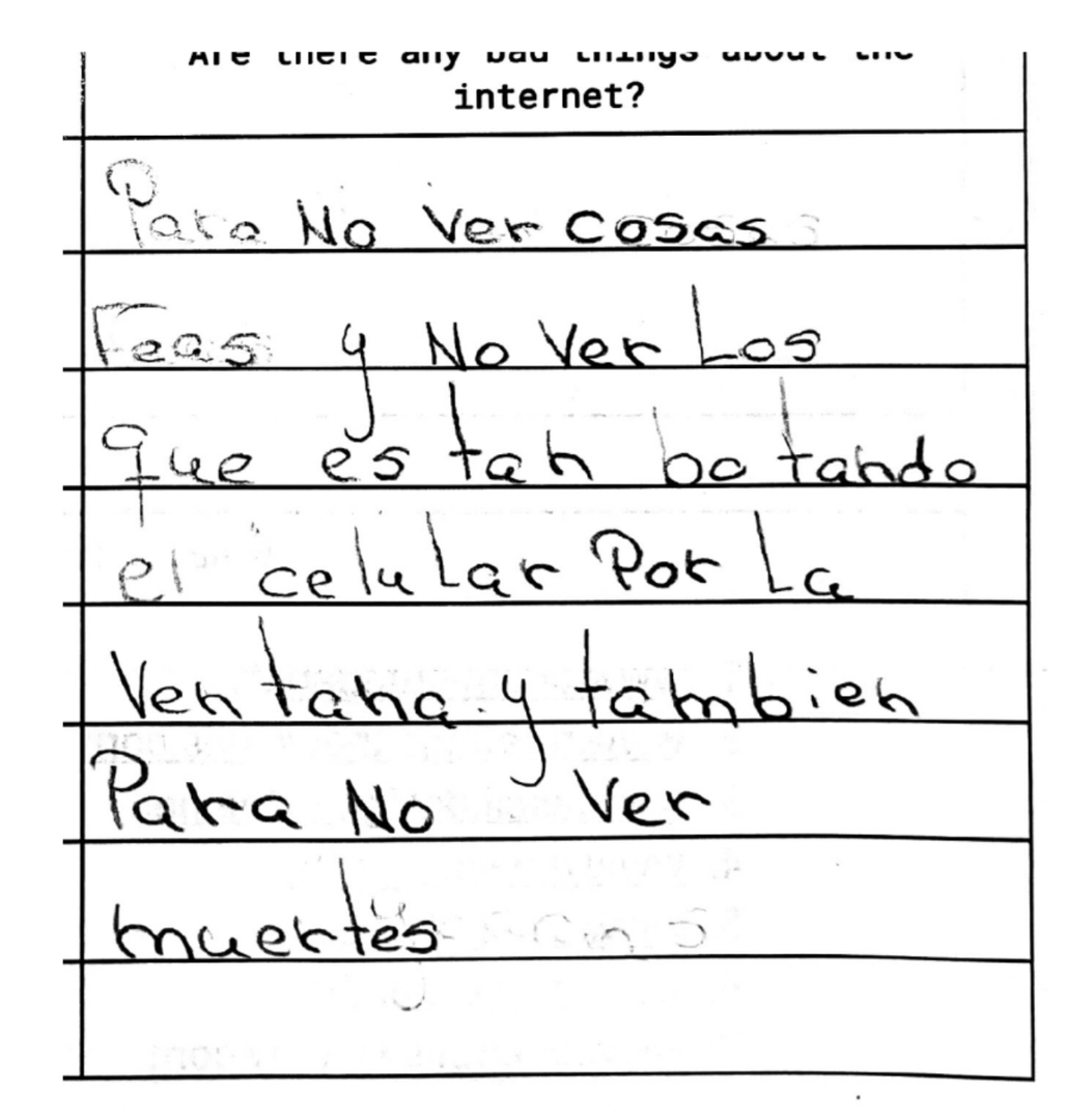 The most common uses for the internet for students are social media platforms, primarily Roblox, TikTok, and YouTube. The bulk of their time online is spent watching short-form video content, playing games, and talking to family and friends. A few students mentioned more complex interactions, such as navigating via Google Maps and cooking recipes. Spanish-speaking students rely heavily on the Internet to learn English.