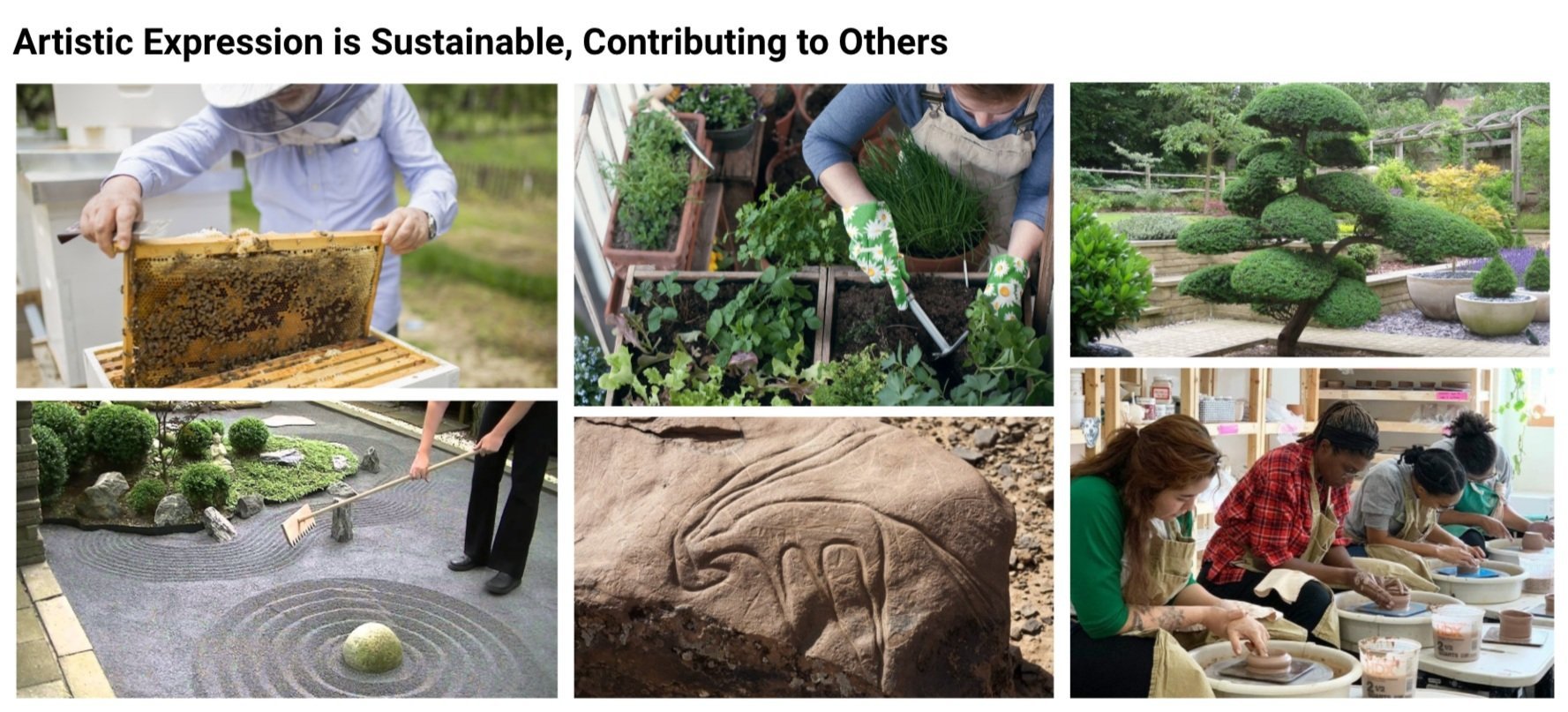 Nature is the best canvas possible. Materials are still malleable at this stage, providing the ability for endless expression without endless production. Not only are these activities meditative, but they also provide benefit past just the self. The use of more permanent material is decided by collective voting - but more casual exploration is documented using other archival methods.