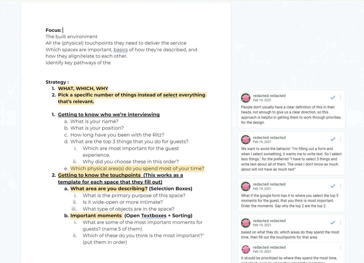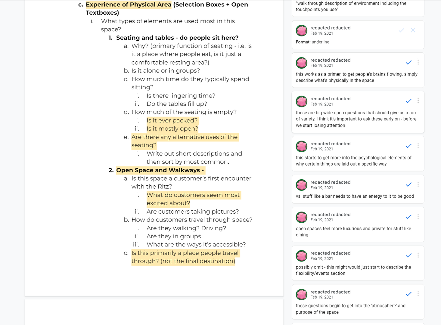 For the duration of our team's stay - I designed and conducted a series of interviews and studies that would help us to develop an overarching picture of all of the hotel's services and specialties.