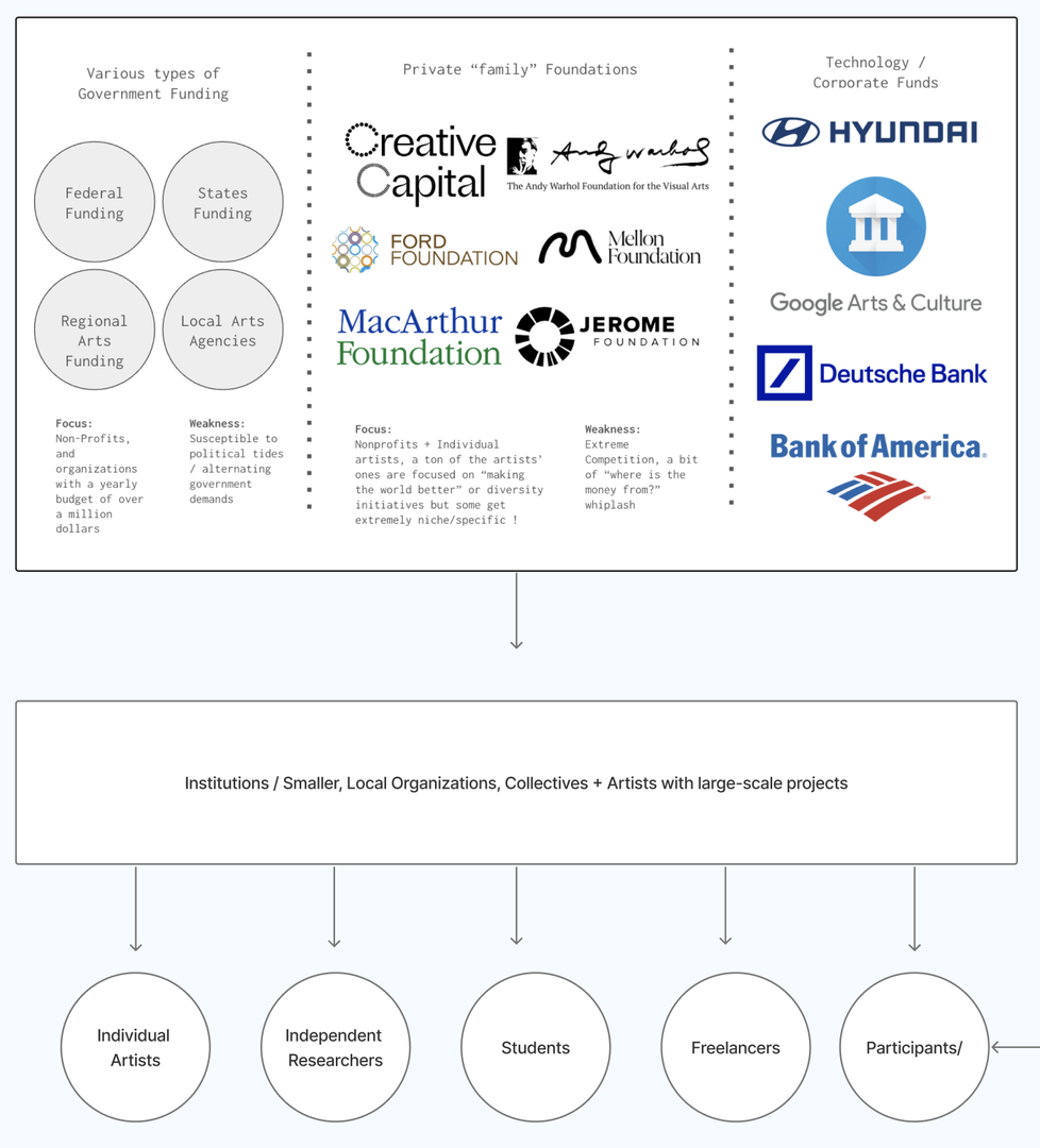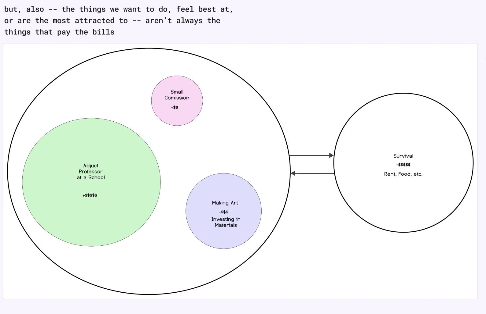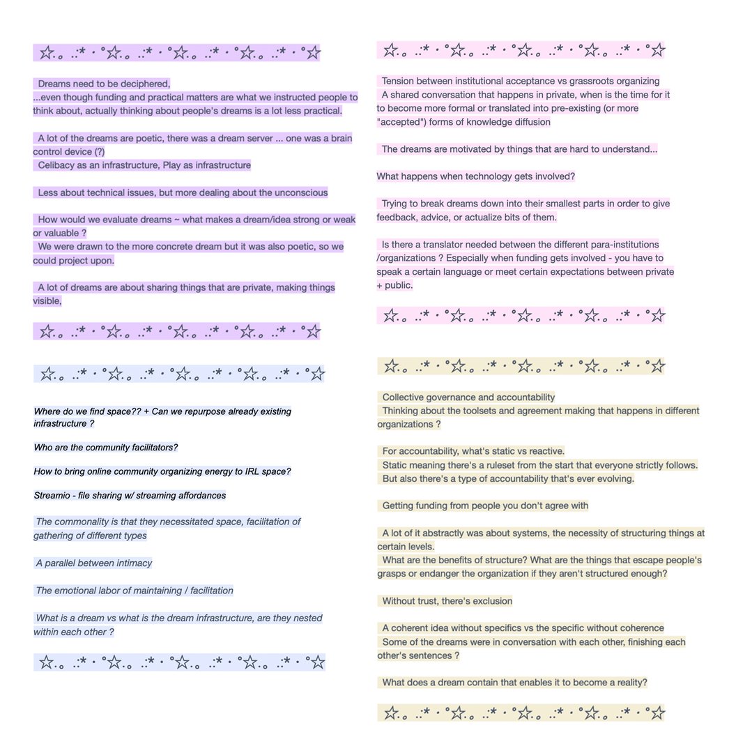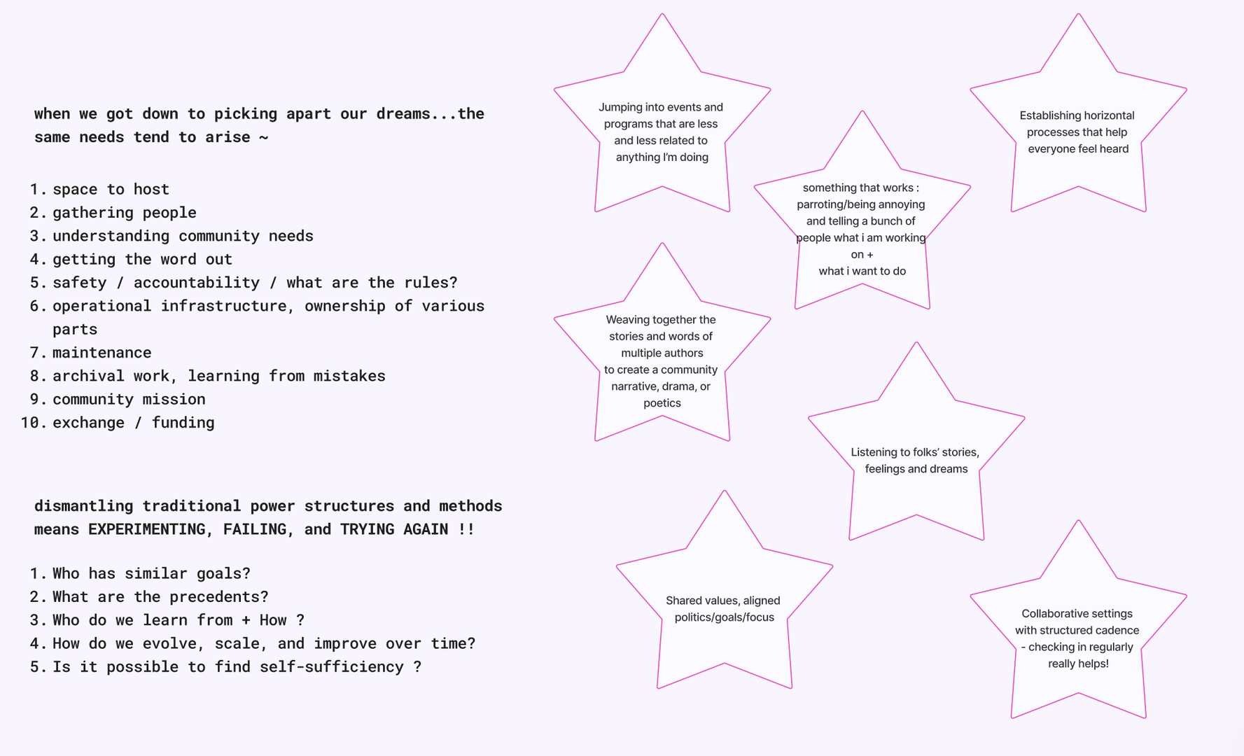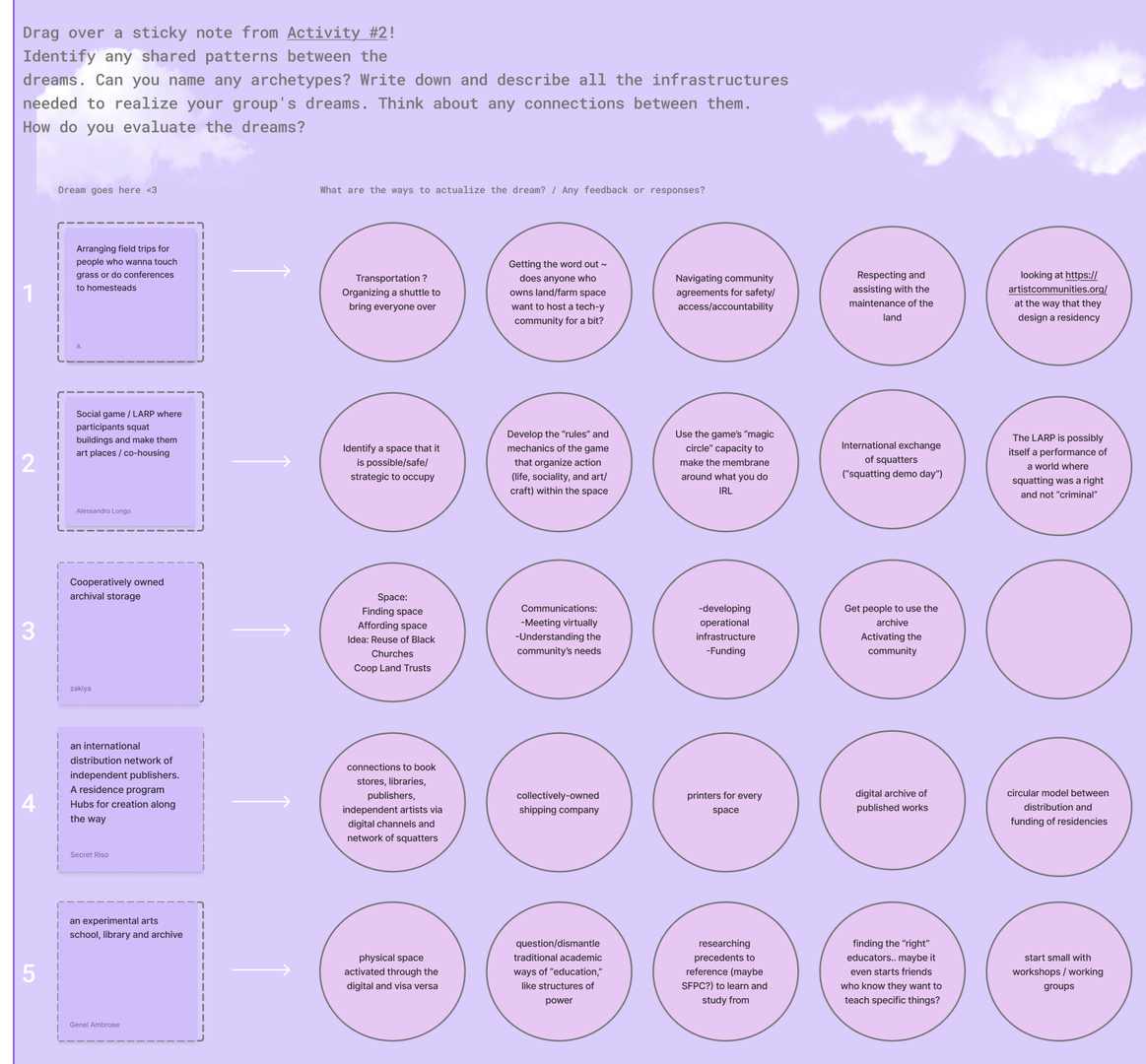 For the more intensive working group, we dug into everything we could think of that enables or inhibits the dream infrastructures that we exist within and work around to survive. The participating group consisted of other community organizers and practicing artists from different timezones and with different experience levels.