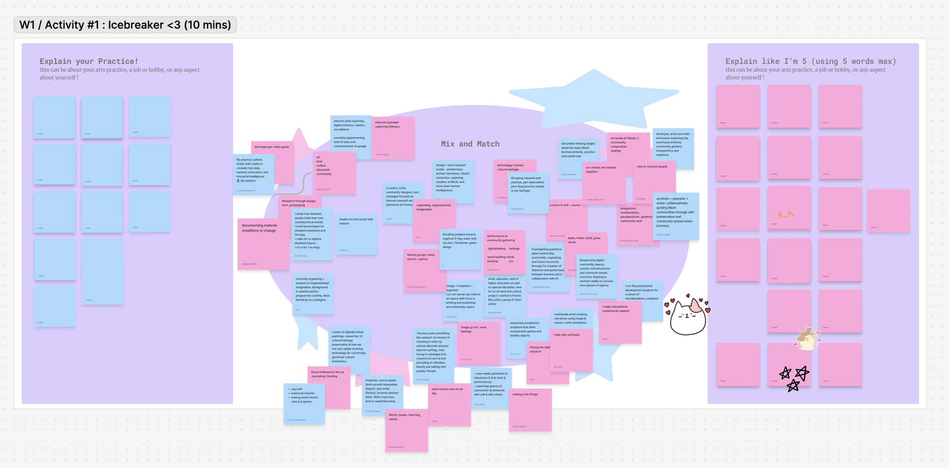 As an icebreaker, we explained our practice, then did the "explain like i'm 5 (in 5 words)" version. We wanted to dig a bit into the tendency to have to translate what you do into different languages/contexts and played a little game with mixing and matching them up.