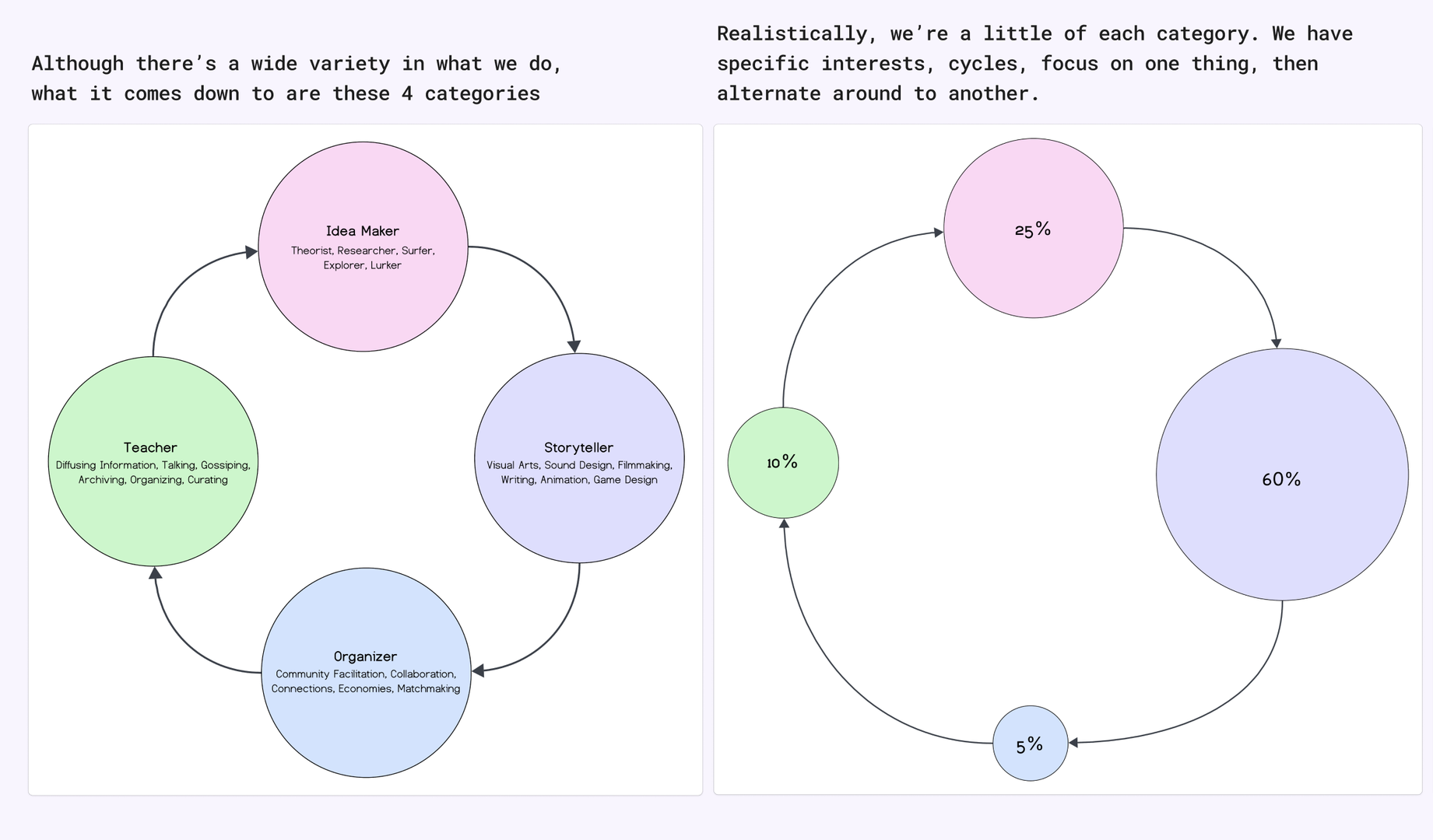 The culture found within the discord is extremely fluid - members shifting between frequent posters and lurkers, becoming the occasional organizer, and using the discord itself as an indexed reference library.