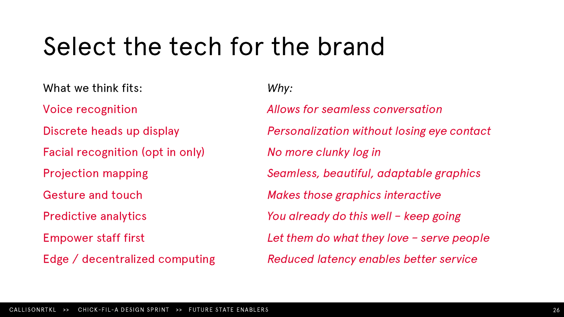 This project features a speculative translation (both short and long-term) of a technologically enabled chick-fil-a brand based on observational studies and research.