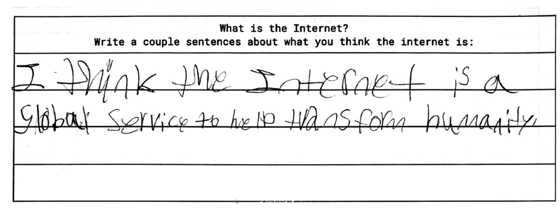 Based on written student responses to questions such as "What does the internet look like?" and "What are good things about the internet?" students have varying levels of access to technology. Each student had significantly different skill levels when interacting with computers, with the lowest competency being actions associated with traditional desktop computers, such as typing on a physical keyboard or right-clicking to copy and paste.