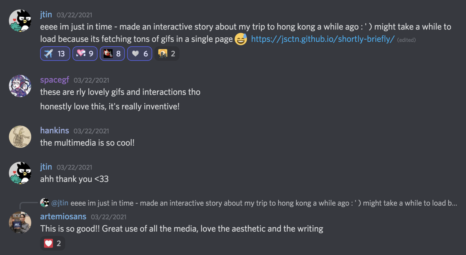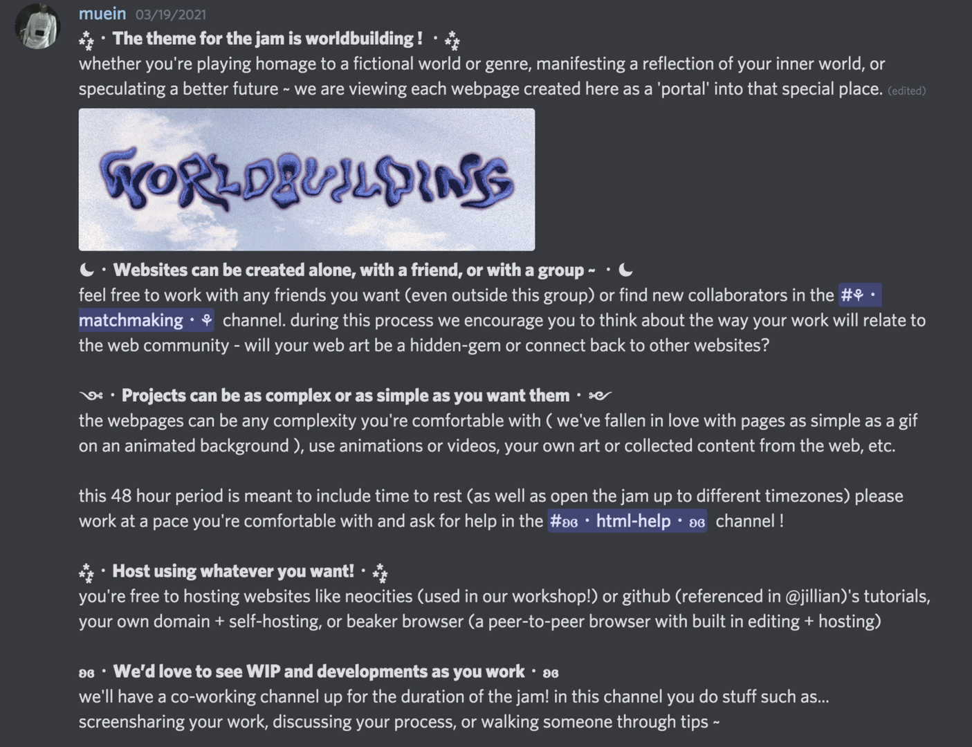 The event was run through discord with about 300 participants ! In the discord group, structures were provided to encourage collaboration, exploration, and learning - including a 24/7 group of volunteer HTML/CSS instructors.