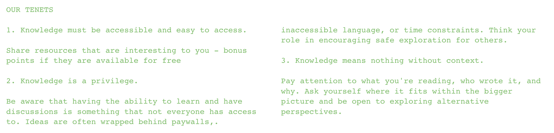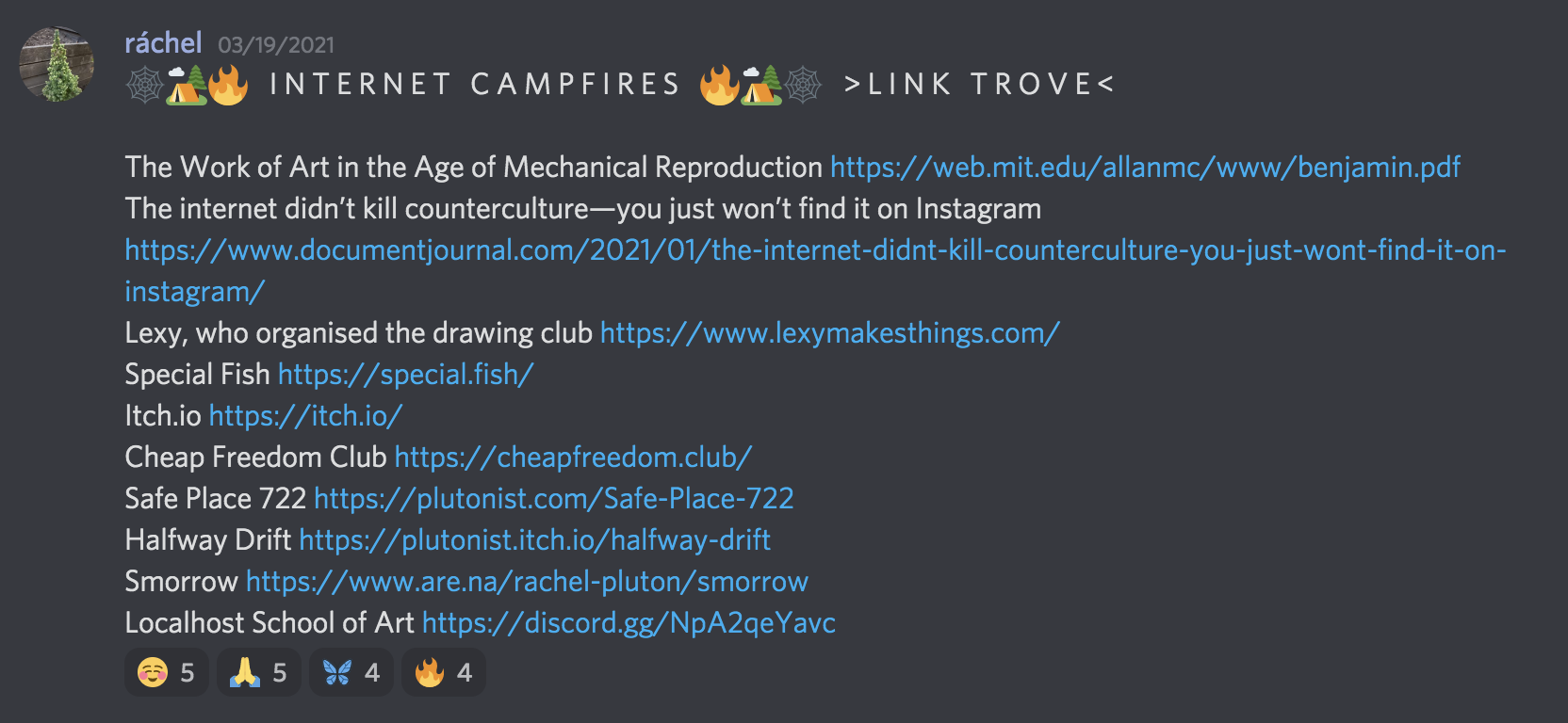 Links shared in the group are roughly beginning to be documented in are.na channels - but the bulk of resources are found within the discord.