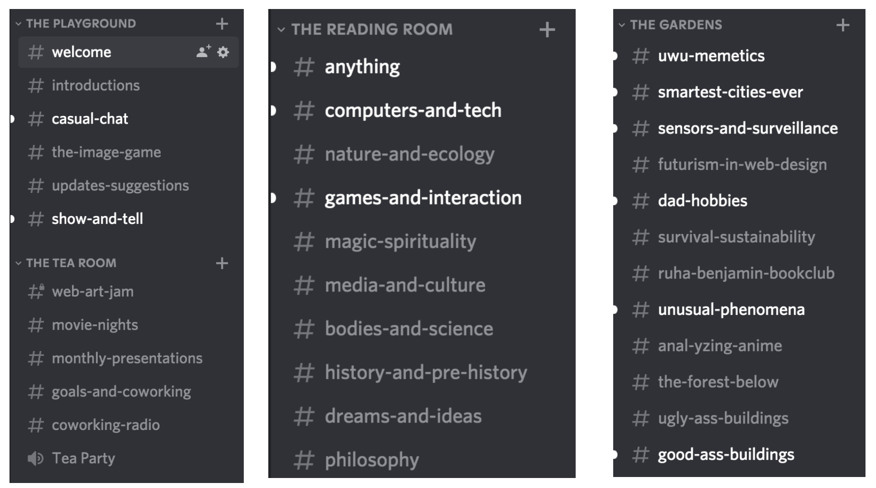 The structure of the group allowed every member to collectively run the group - anyone could create channels, host events, and spark discussion. There were a few reoccurring events such as 'movie nights', 'discussion groups', and monthly "present anything" days.