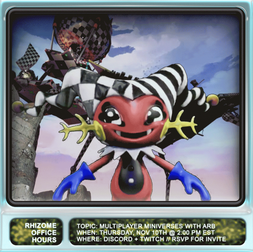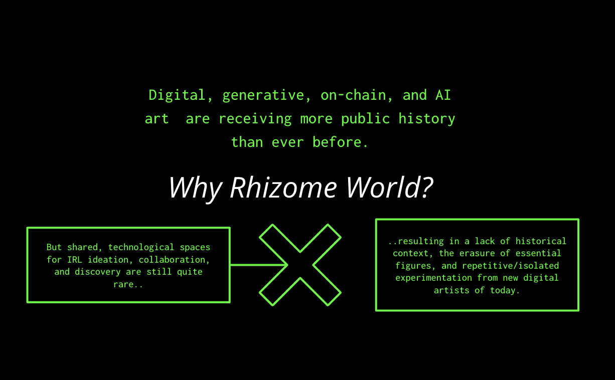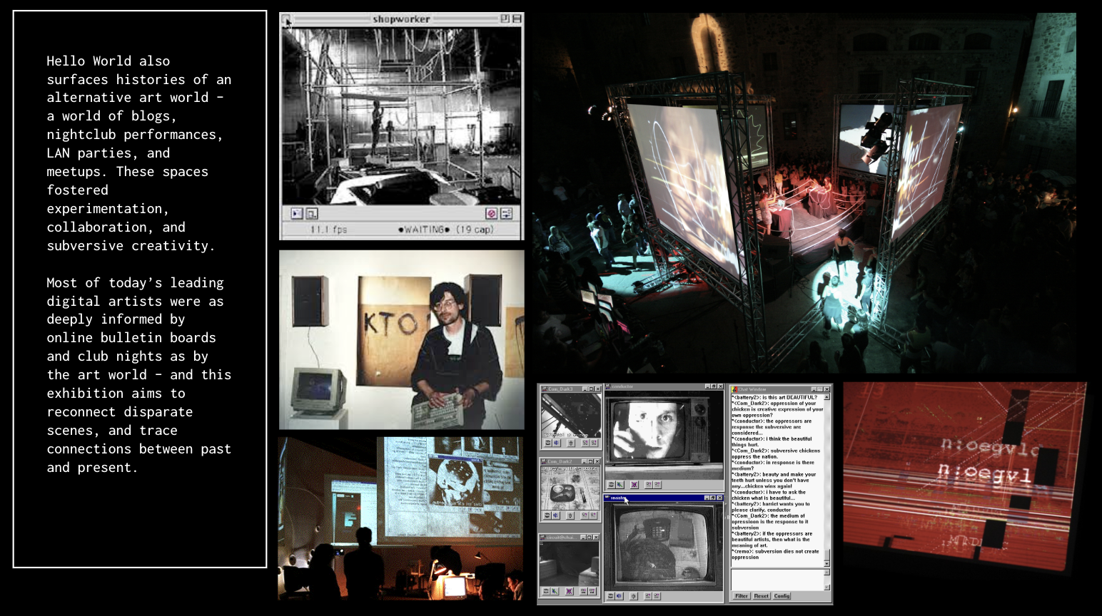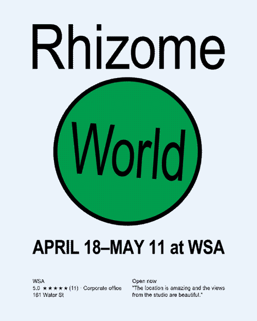 Rhizome World was an experiment in gathering a wide-range of artistic disciplines that relate to the use of software in one massive, nerdy wonderland. It featured a ton of archival works, mostly emulated in virtual machines and running on a variety of CRTs/tablets thanks to rhizome's preservation team. A ton of guest curators/partners from everywhere in the world - that really made it feel like this insane community effort Plus, a few of newly commissioned works, thanks to fleeting federal arts funding~