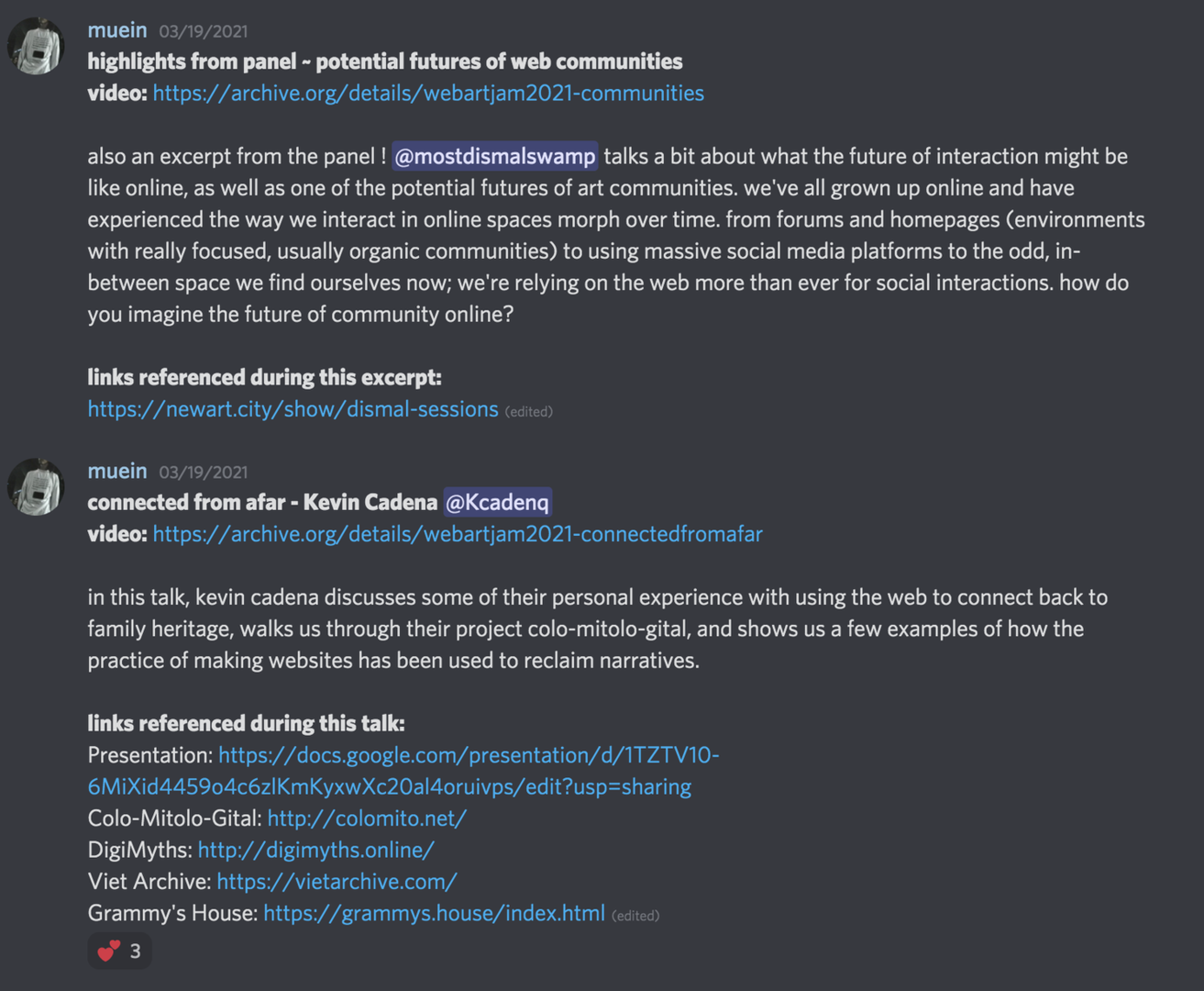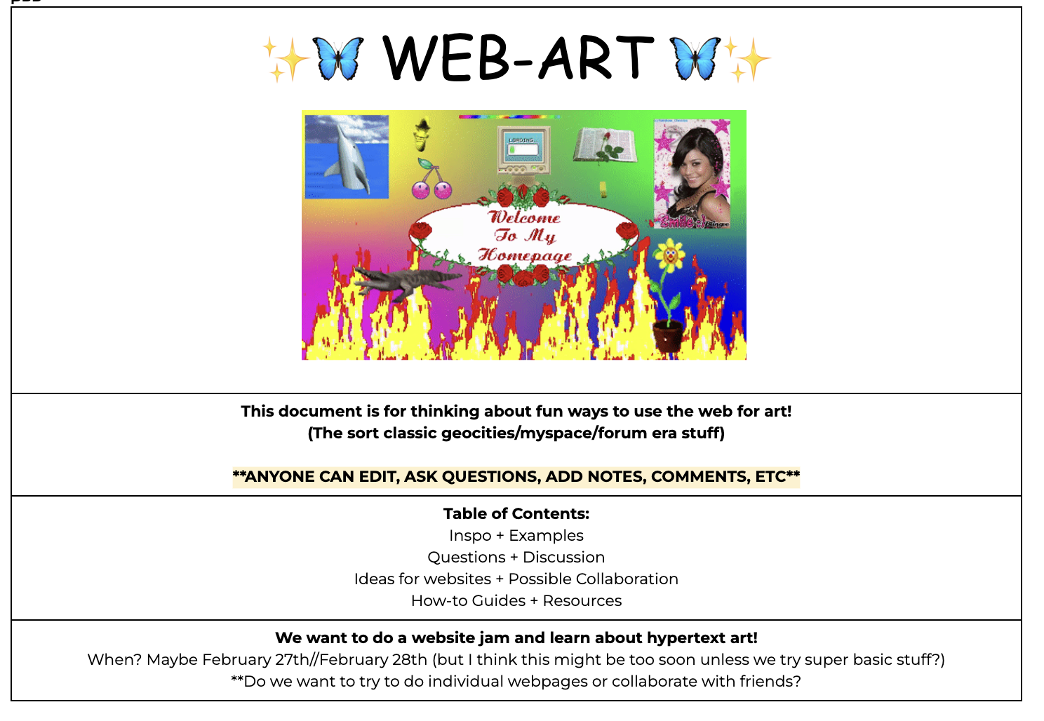 The Web Art Jam was an international weeklong series of talks and workshops, leading up to a 2-day website creation jam! We designed the programming/structure of the festival to work for anytimezone participants might be in. The festival involved a temporary discord that closed following the end of the events -- we streamed talks to twitch. A few remnants of this event are on