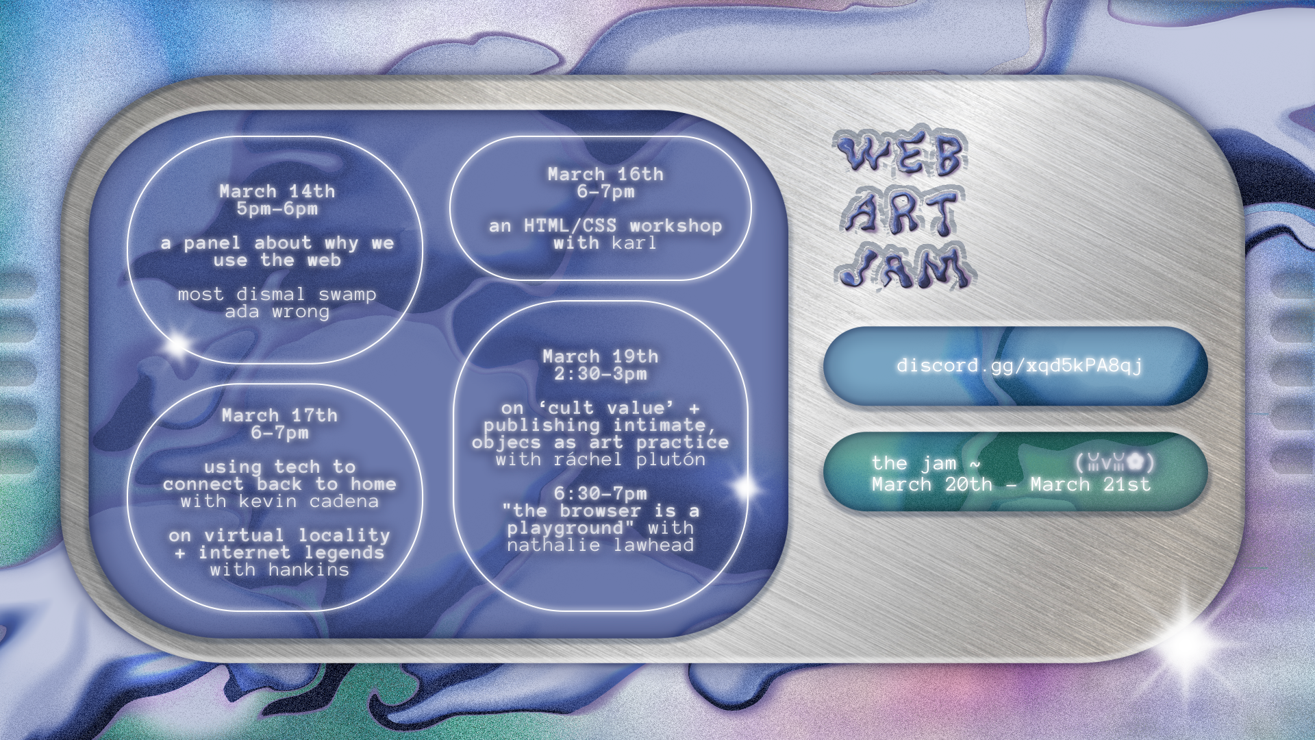 The Web Art Jam was an international weeklong series of talks and workshops, leading up to a 2-day website creation jam! We designed the programming/structure of the festival to work for any timezone participants might be in. The festival involved a temporary discord that closed following the end of the events -- we streamed talks to twitch. A few remnants of this event are on